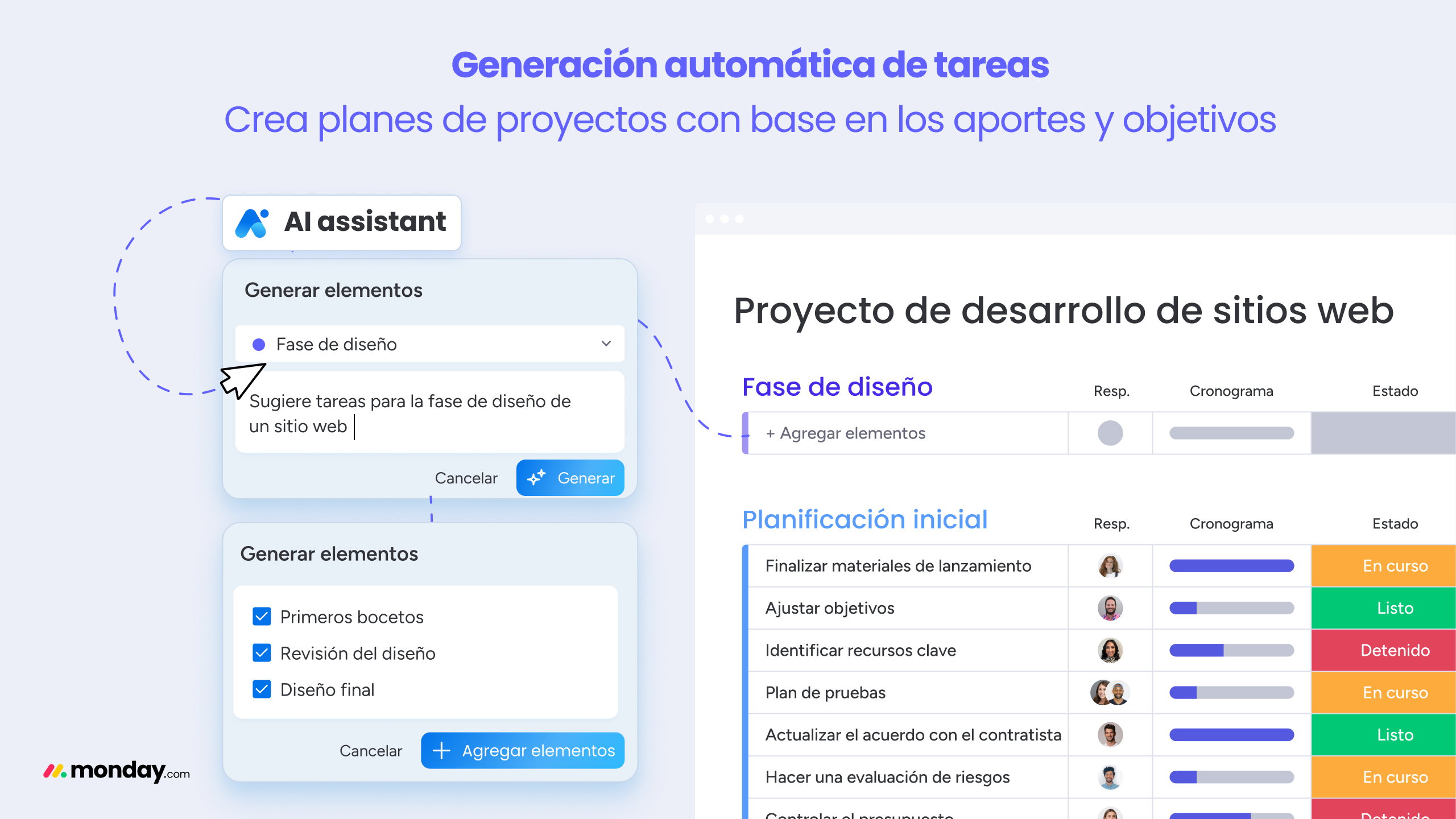 - Generación automática de tareas: crea planes de proyectos sin dificultad y en menos tiempo con base en los aportes y los objetivos del cliente.